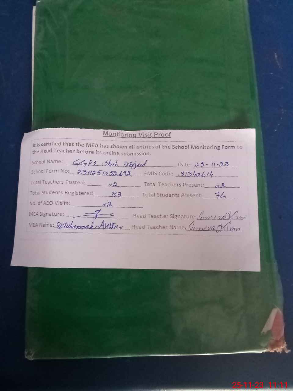 | Attendance Register | Head Teacher | MEA with School | Visit Proof |