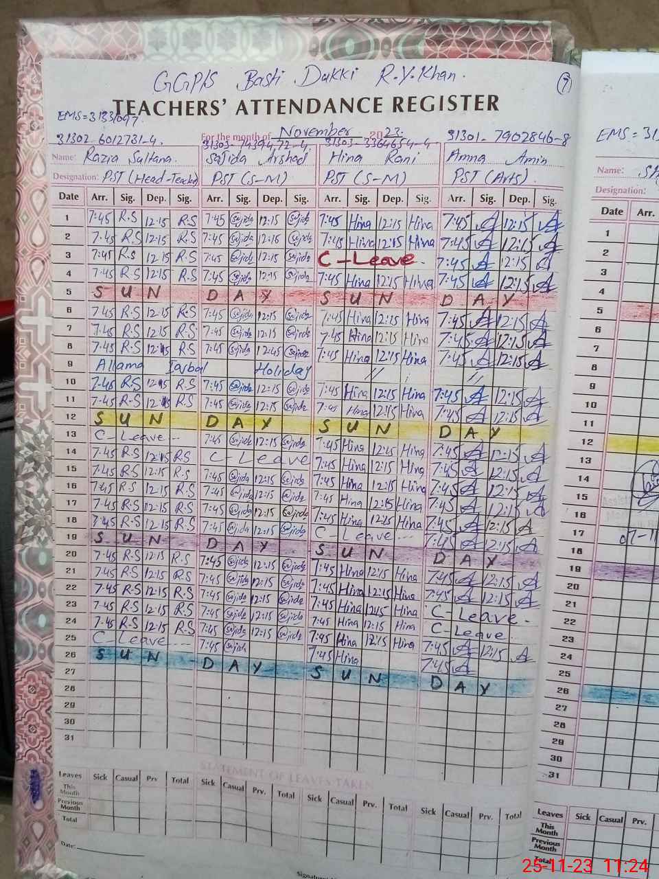 | CNIC | Full Name | Designation | R/C | Absence During Last Calender Month |