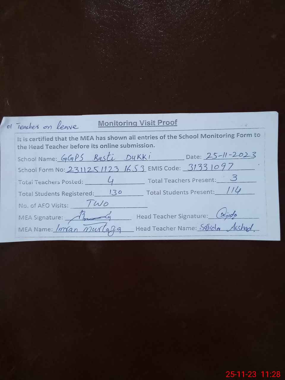 | Attendance Register | Head Teacher | MEA with School | Visit Proof |