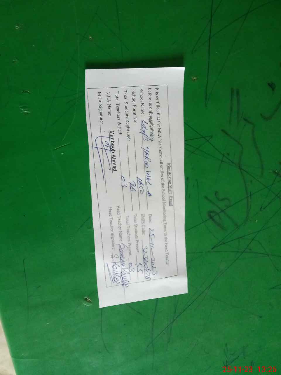 | Attendance Register | Head Teacher | MEA with School | Visit Proof |