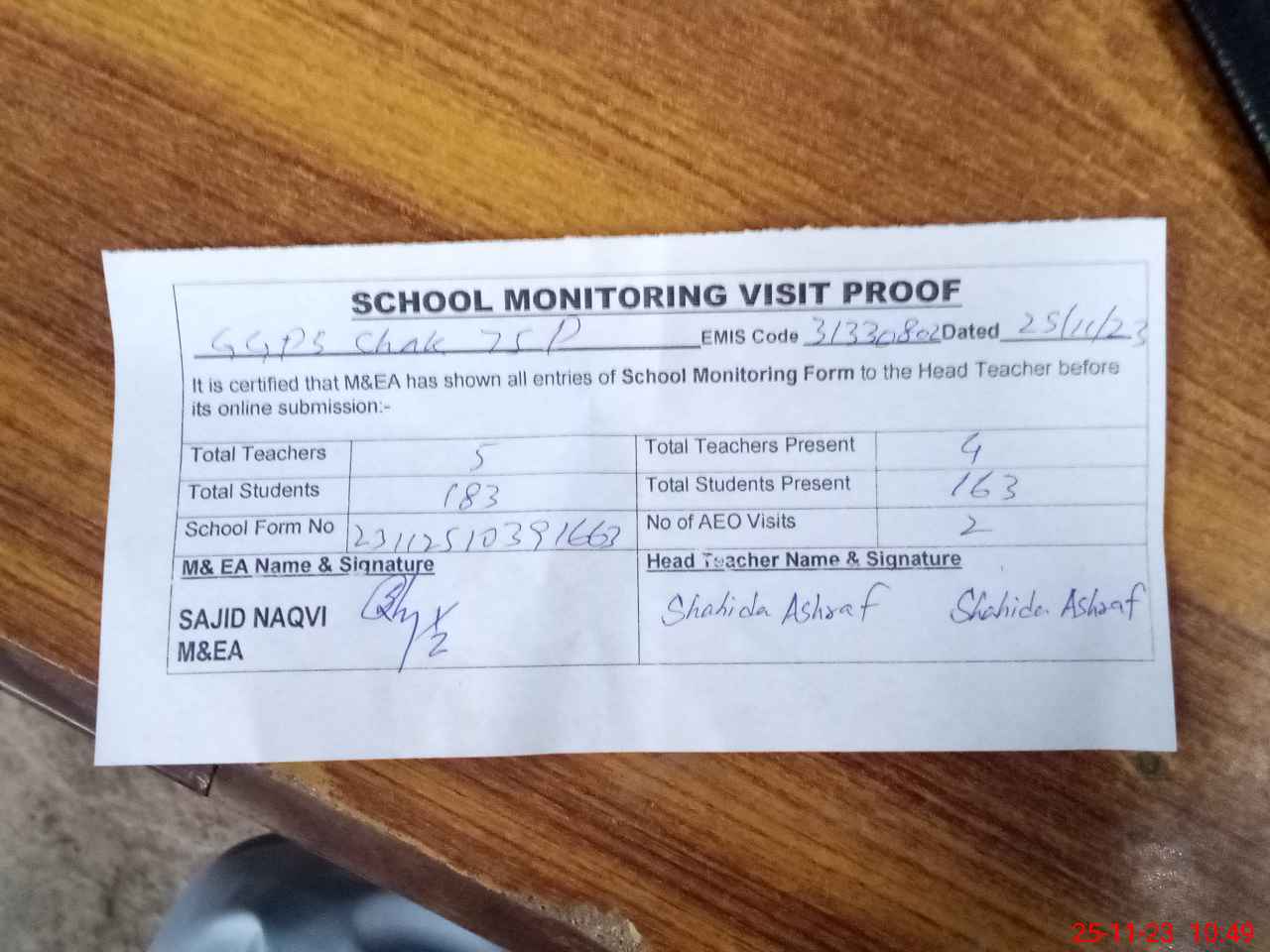 | Attendance Register | Head Teacher | MEA with School | Visit Proof |