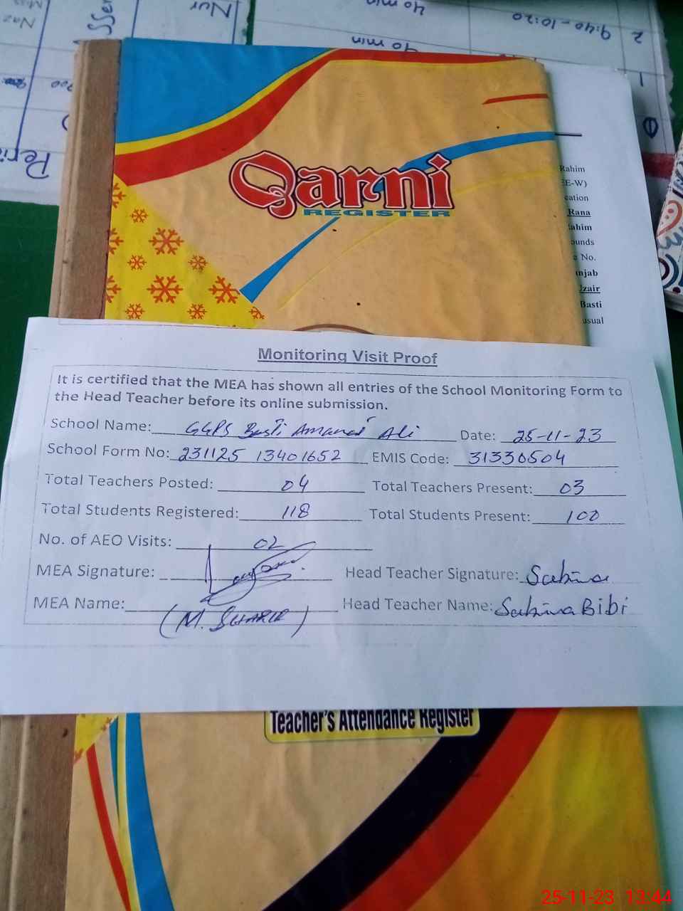 | Attendance Register | Head Teacher | MEA with School | Visit Proof |
