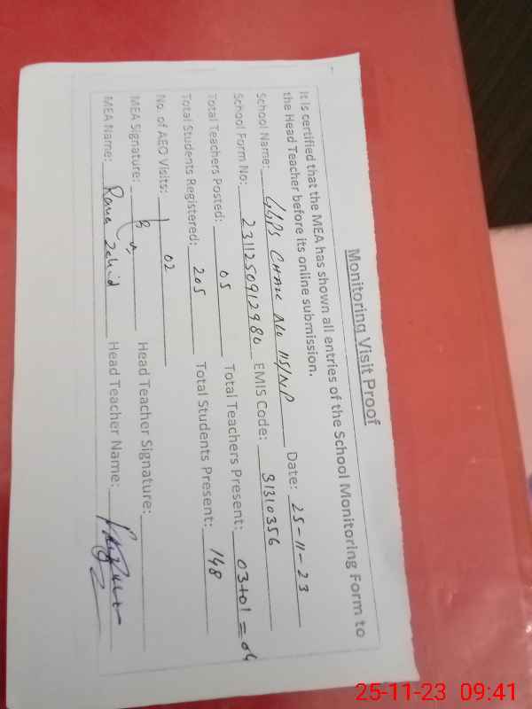 | Attendance Register | Head Teacher | MEA with School | Visit Proof |