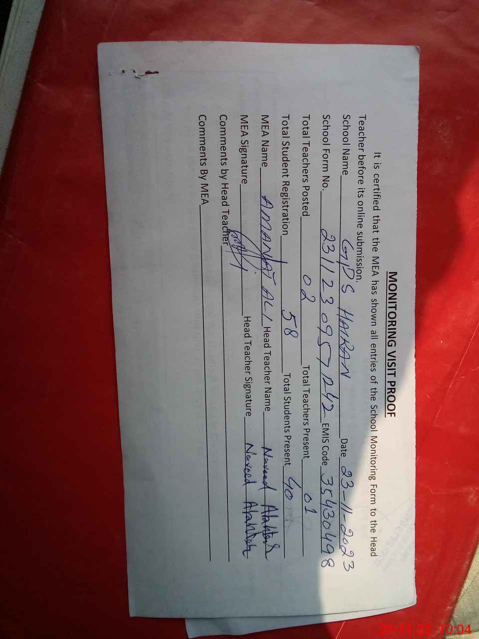 | Attendance Register | Head Teacher | MEA with School | Visit Proof |