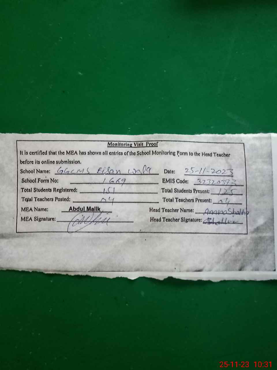 | Attendance Register | Head Teacher | MEA with School | Visit Proof |
