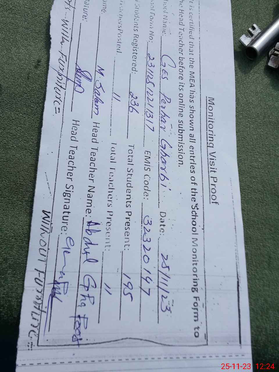 | Attendance Register | Head Teacher | MEA with School | Visit Proof |