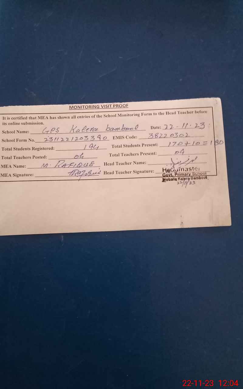 | EMIS Code: 38220302 | Name of School: GPS MOHALLA KALERA BAMBOOL | |||