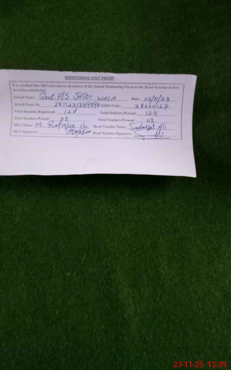 | EMIS Code: 38220127 | Name of School: GPS JATOI WALA | |||