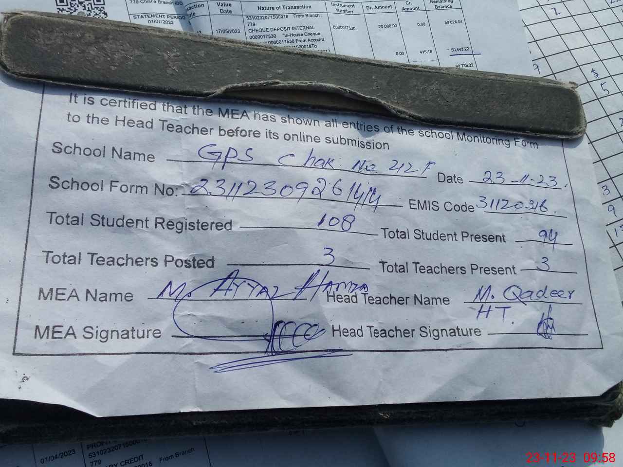 | EMIS Code: 31120316 | Name of School: GPS CHAK NO 212/F | |||