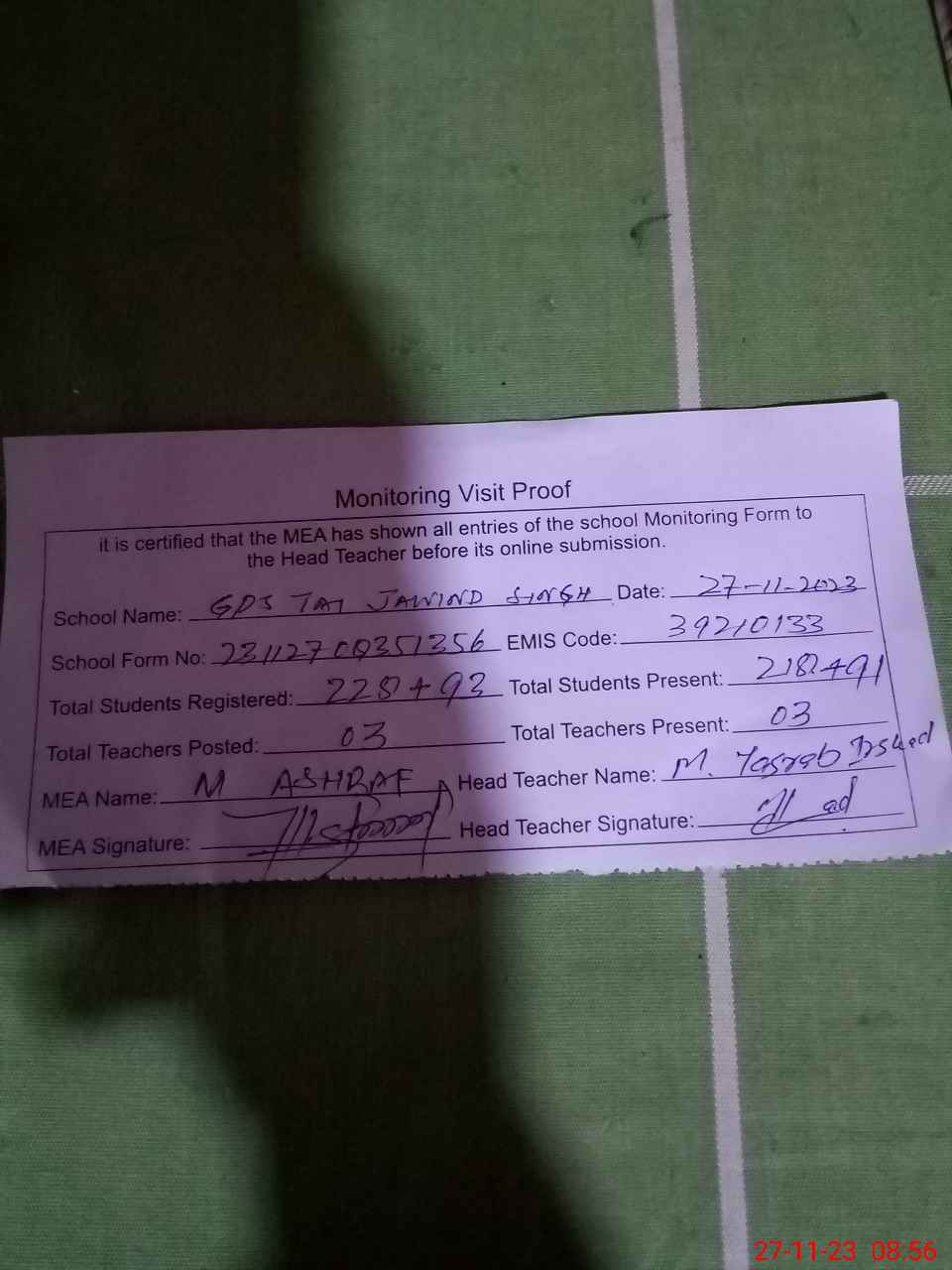 | Attendance Register | Head Teacher | MEA with School | Visit Proof |