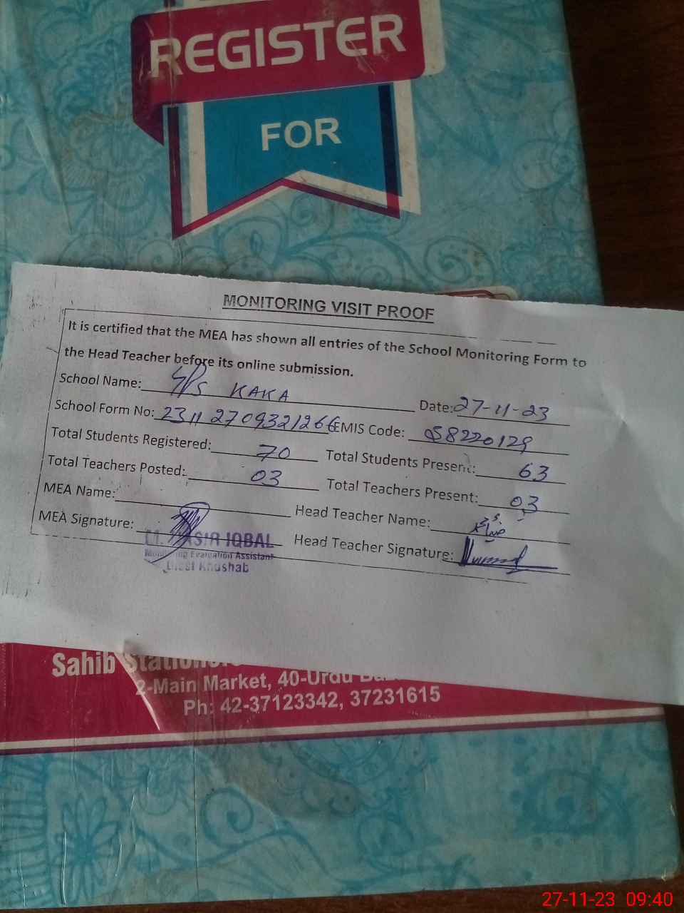 | Attendance Register | Head Teacher | MEA with School | Visit Proof |