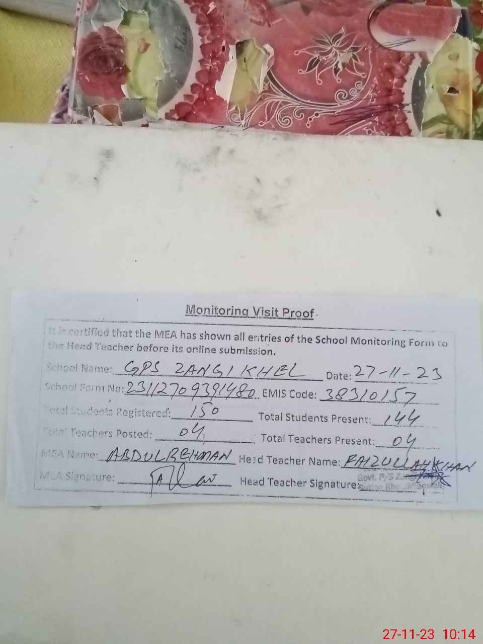| EMIS Code: 38310157 | Name of School: GPS ZANGHI KHEL | |||