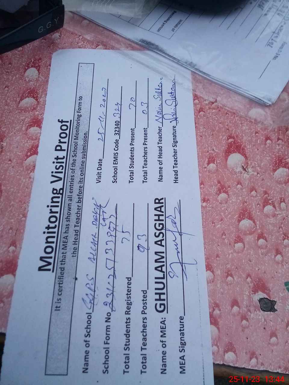 | Attendance Register | Head Teacher | MEA with School | Visit Proof |