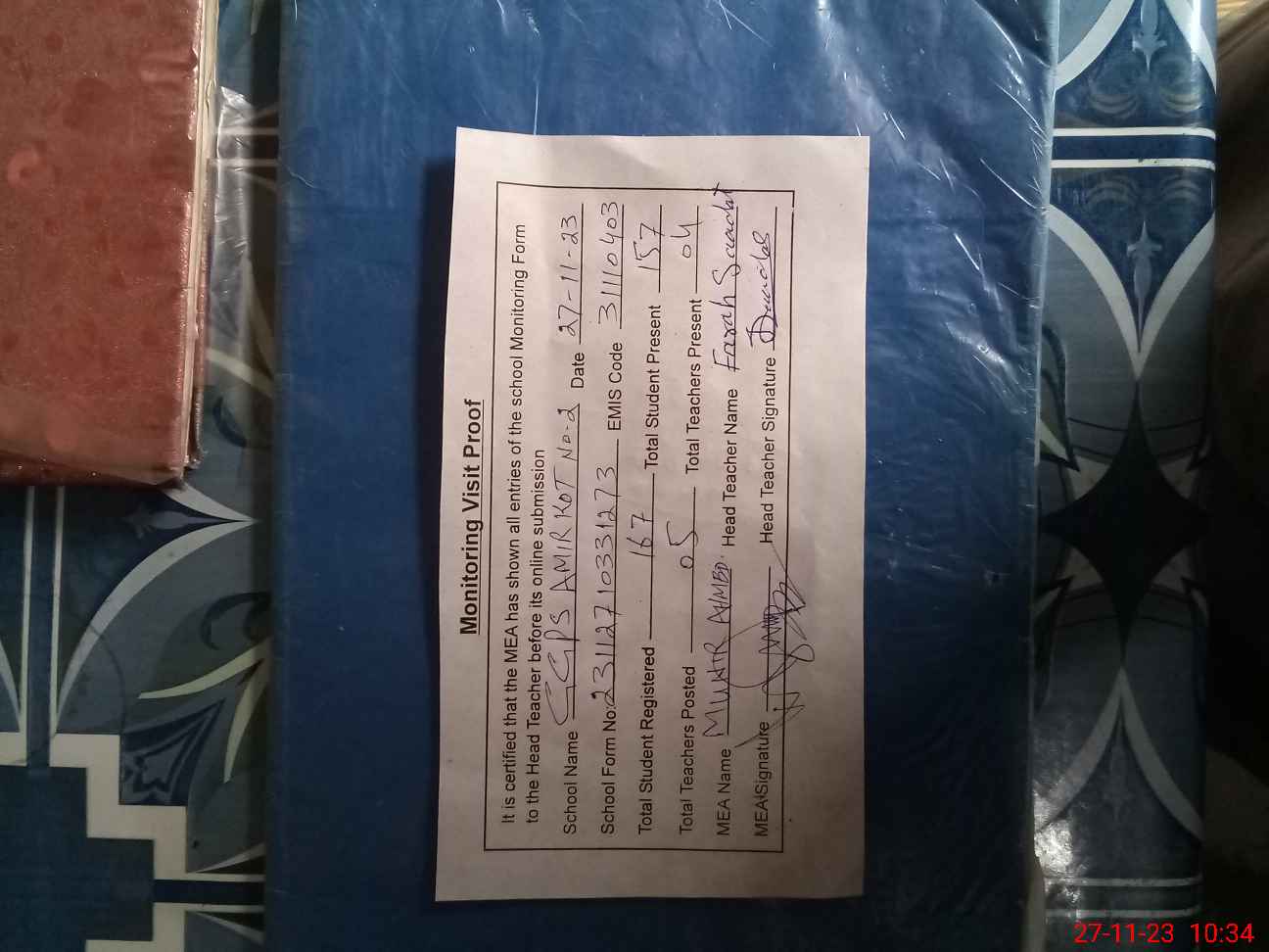 | Attendance Register | Head Teacher | MEA with School | Visit Proof |