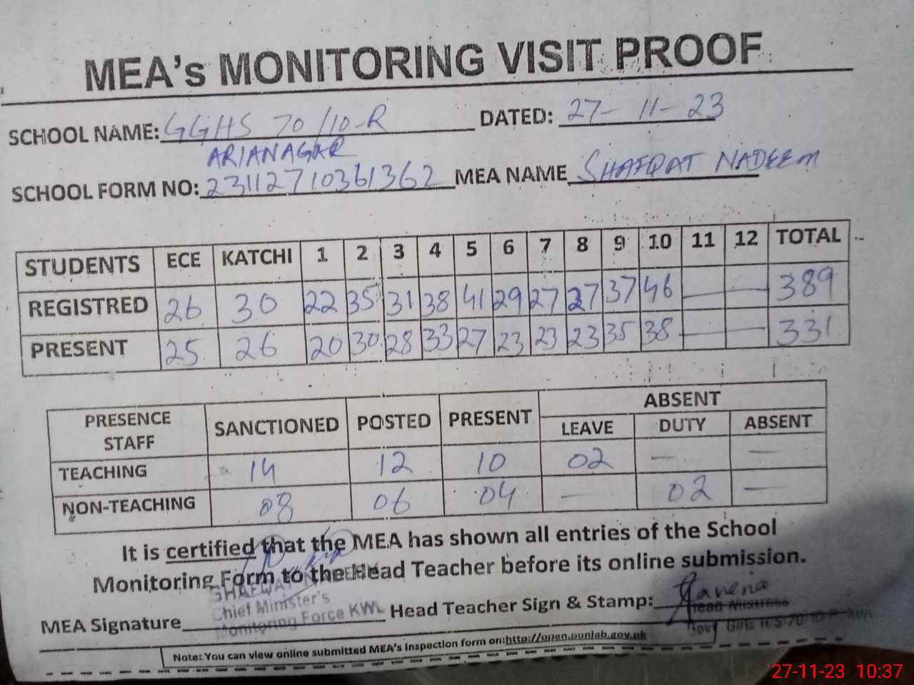 | EMIS Code: 36420386 | Name of School: GGHS 70/10-R ARIANAGAR, KHANEWAL | |||