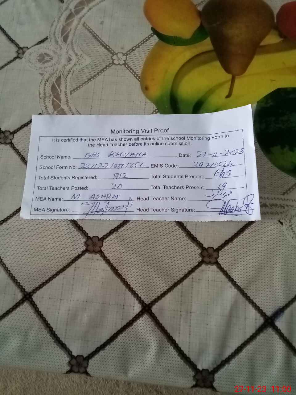 | Attendance Register | Head Teacher | MEA with School | Visit Proof |