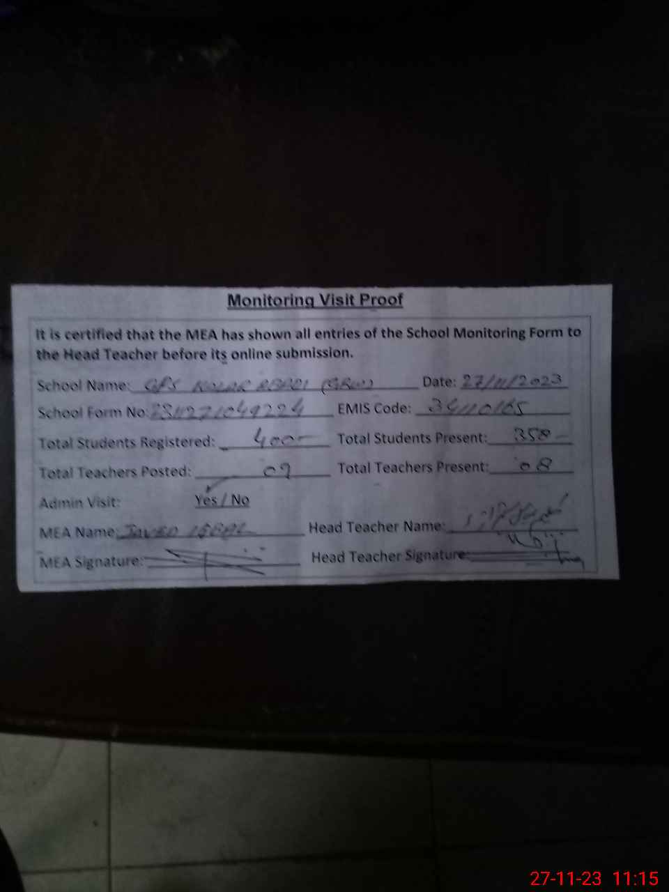 | Attendance Register | Head Teacher | MEA with School | Visit Proof |