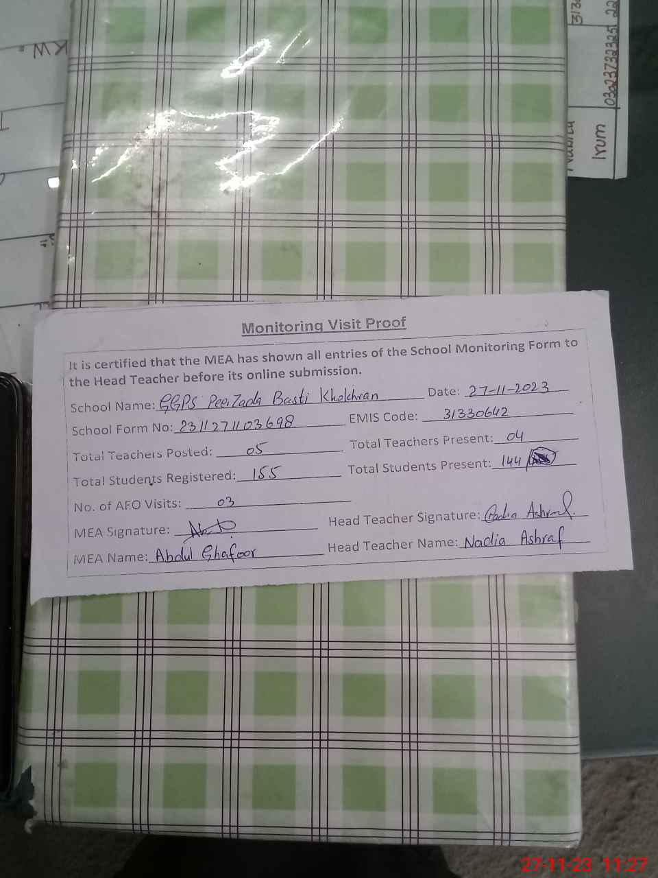 | Attendance Register | Head Teacher | MEA with School | Visit Proof |