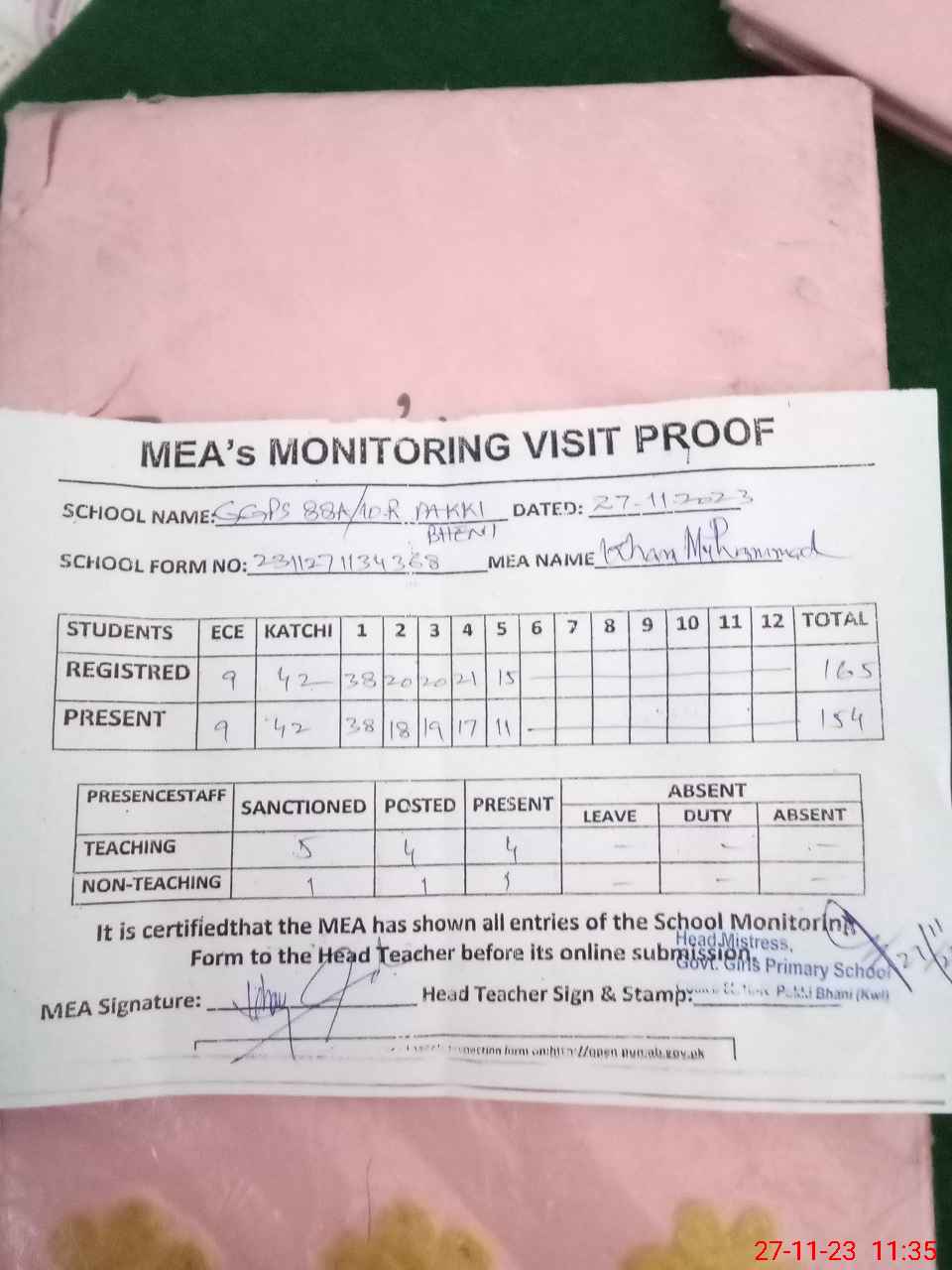 | Attendance Register | Head Teacher | MEA with School | Visit Proof |