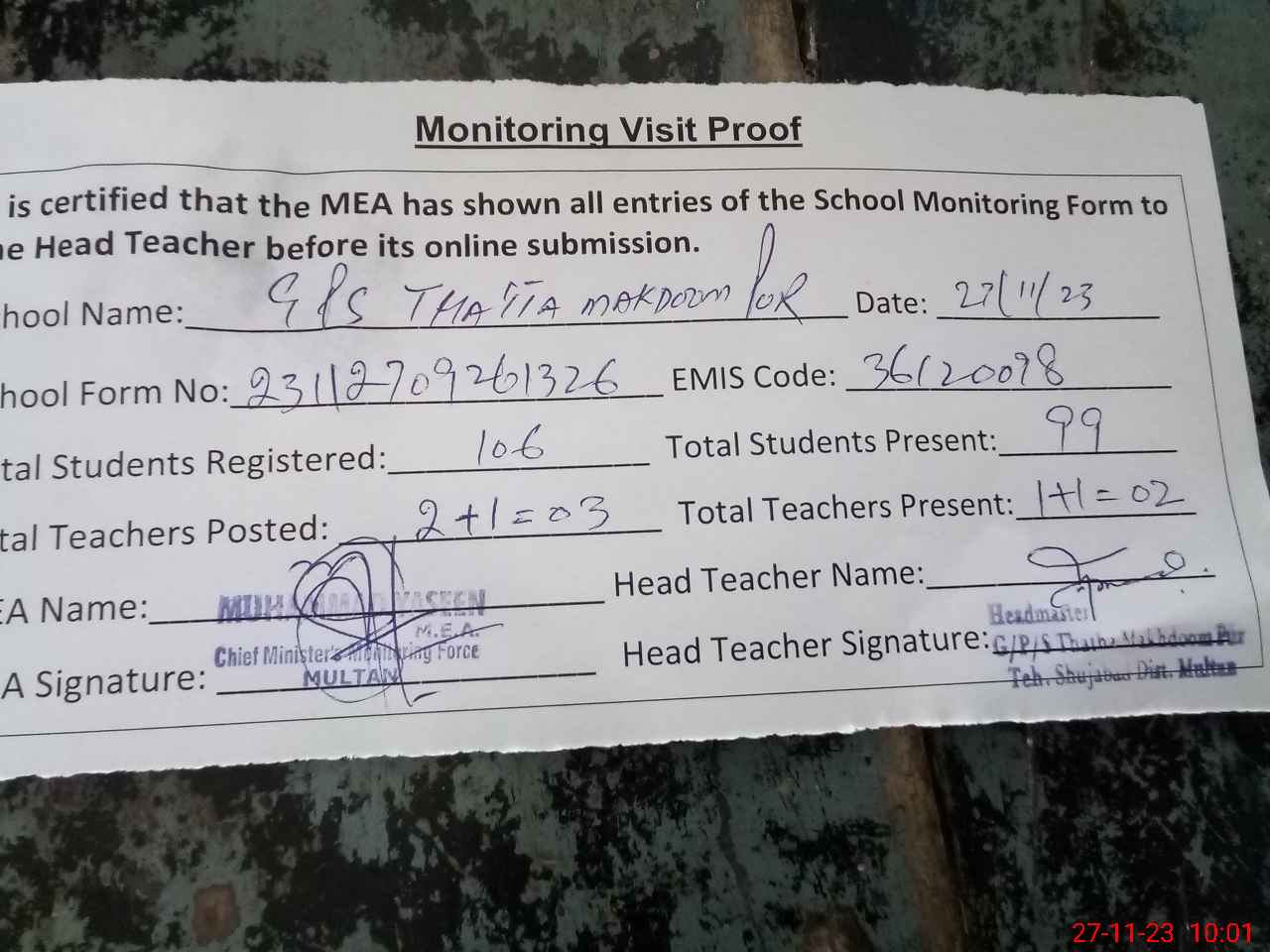 | Attendance Register | Head Teacher | MEA with School | Visit Proof |