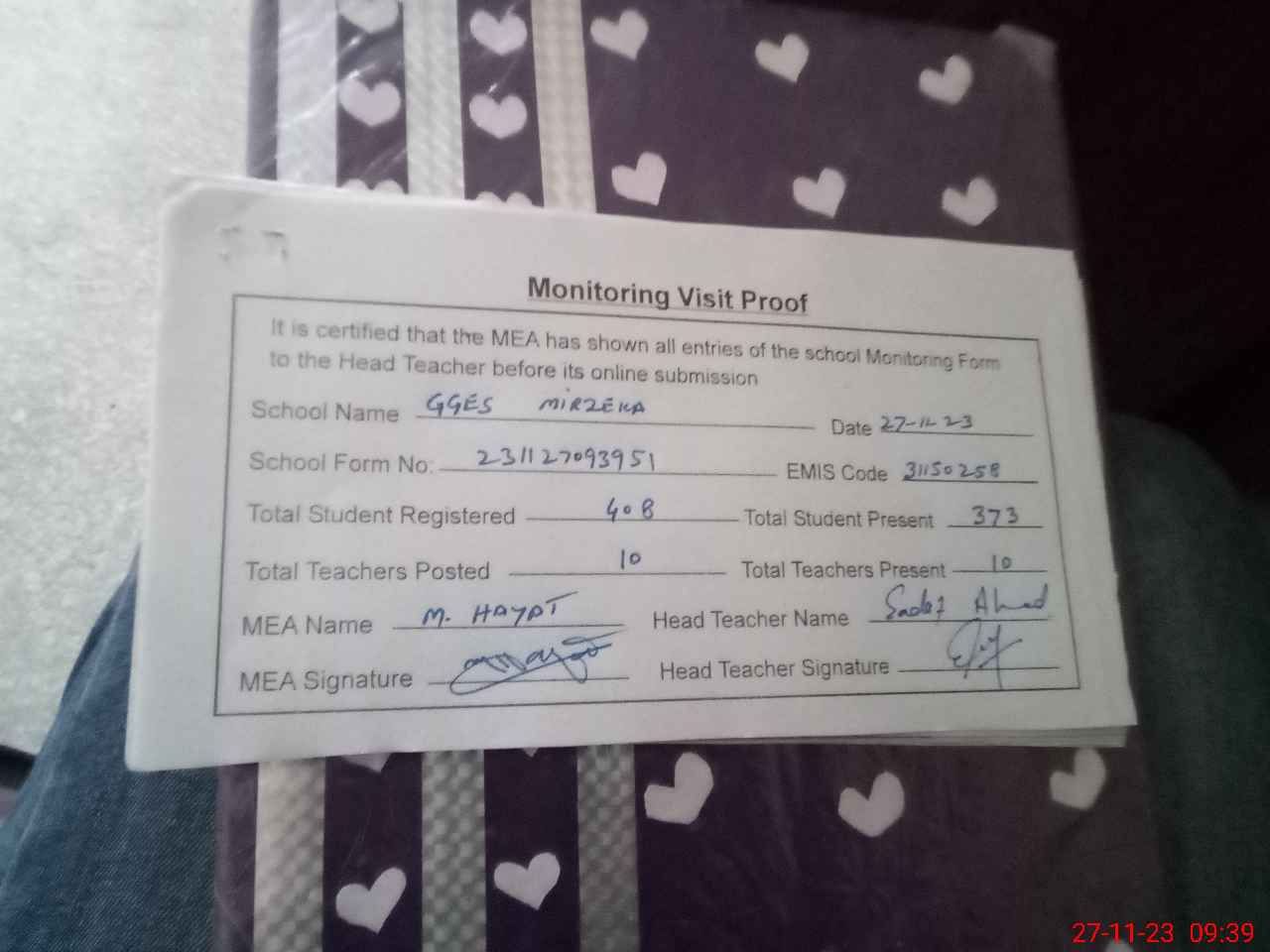 | EMIS Code: 31150258 | Name of School: GGHS KHOL MIRZEKA | |||