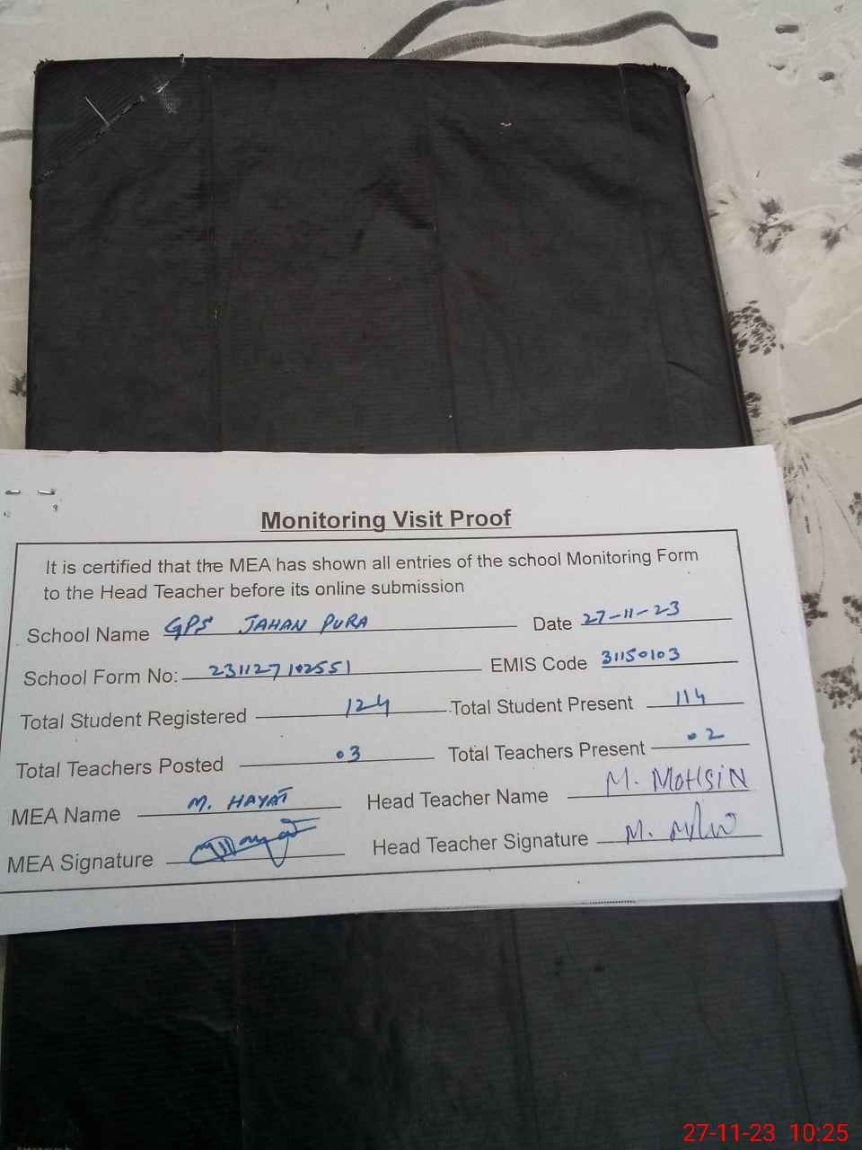 | Attendance Register | Head Teacher | MEA with School | Visit Proof |