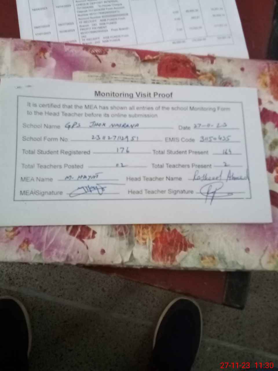 | Attendance Register | Head Teacher | MEA with School | Visit Proof |