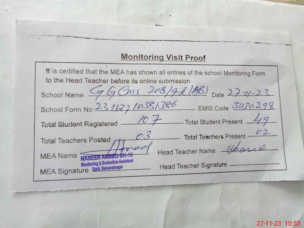 | EMIS Code: 31130298 | Name of School: GGCMS CHAK NO. 208/9-R AZAFI BASTI | |||