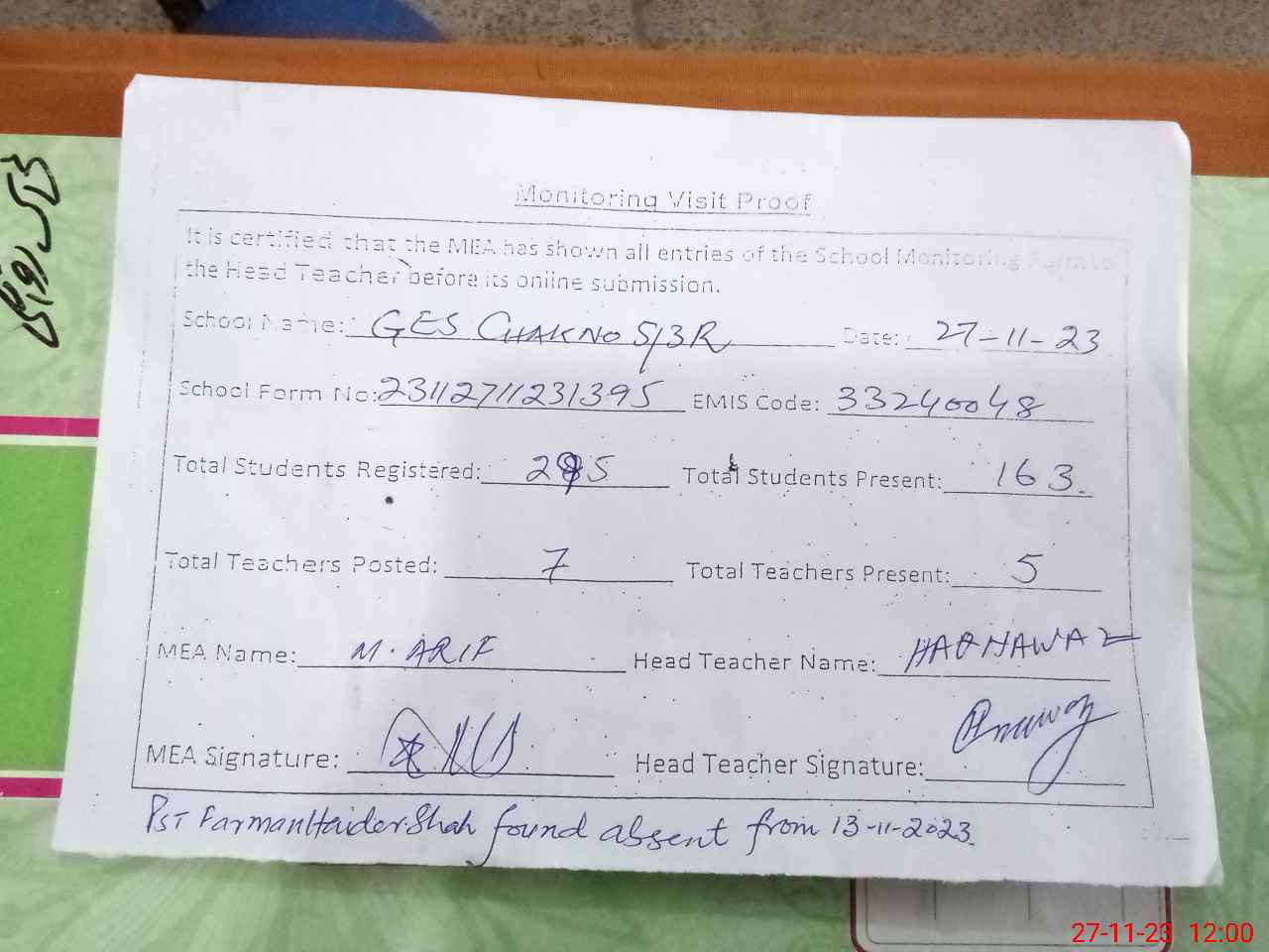 | Attendance Register | Head Teacher | MEA with School | Visit Proof |