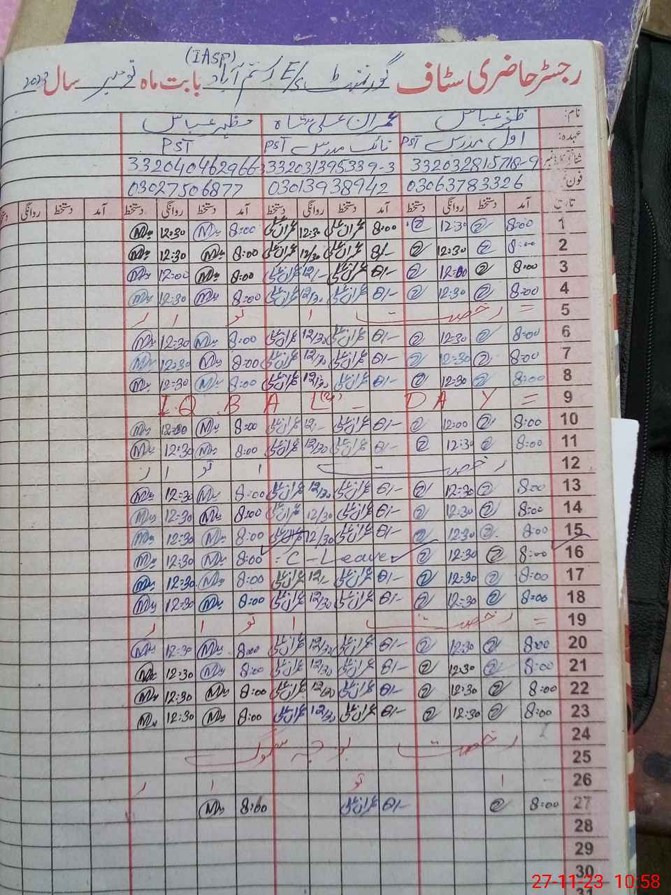 | CNIC | Full Name | Designation | R/C | Absence During Last Calender Month |