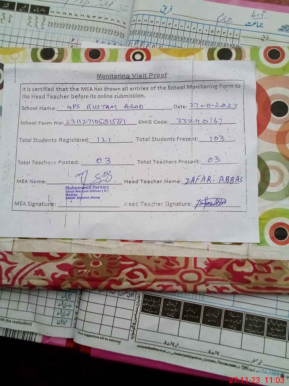 | Attendance Register | Head Teacher | MEA with School | Visit Proof |