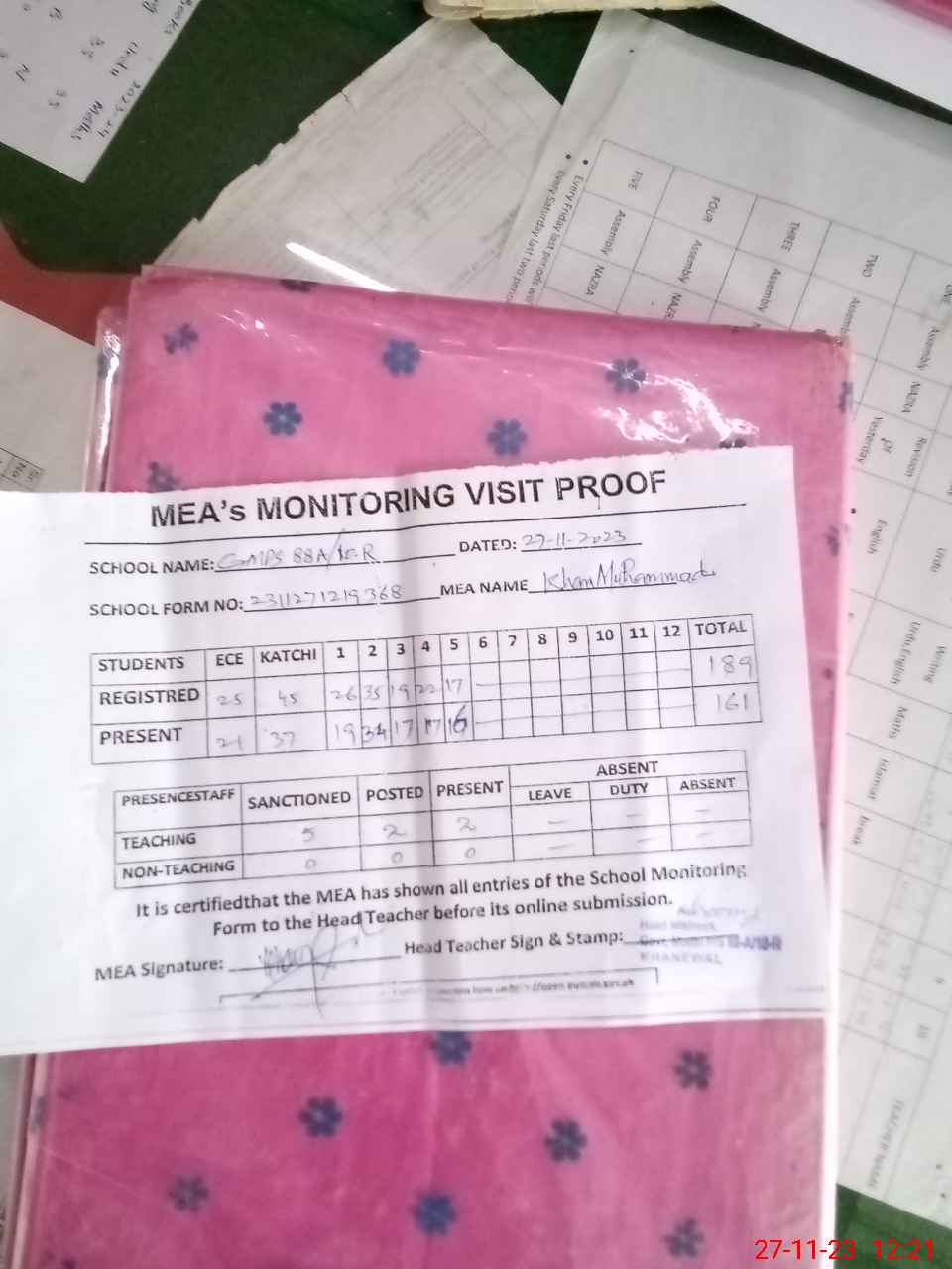 | Attendance Register | Head Teacher | MEA with School | Visit Proof |