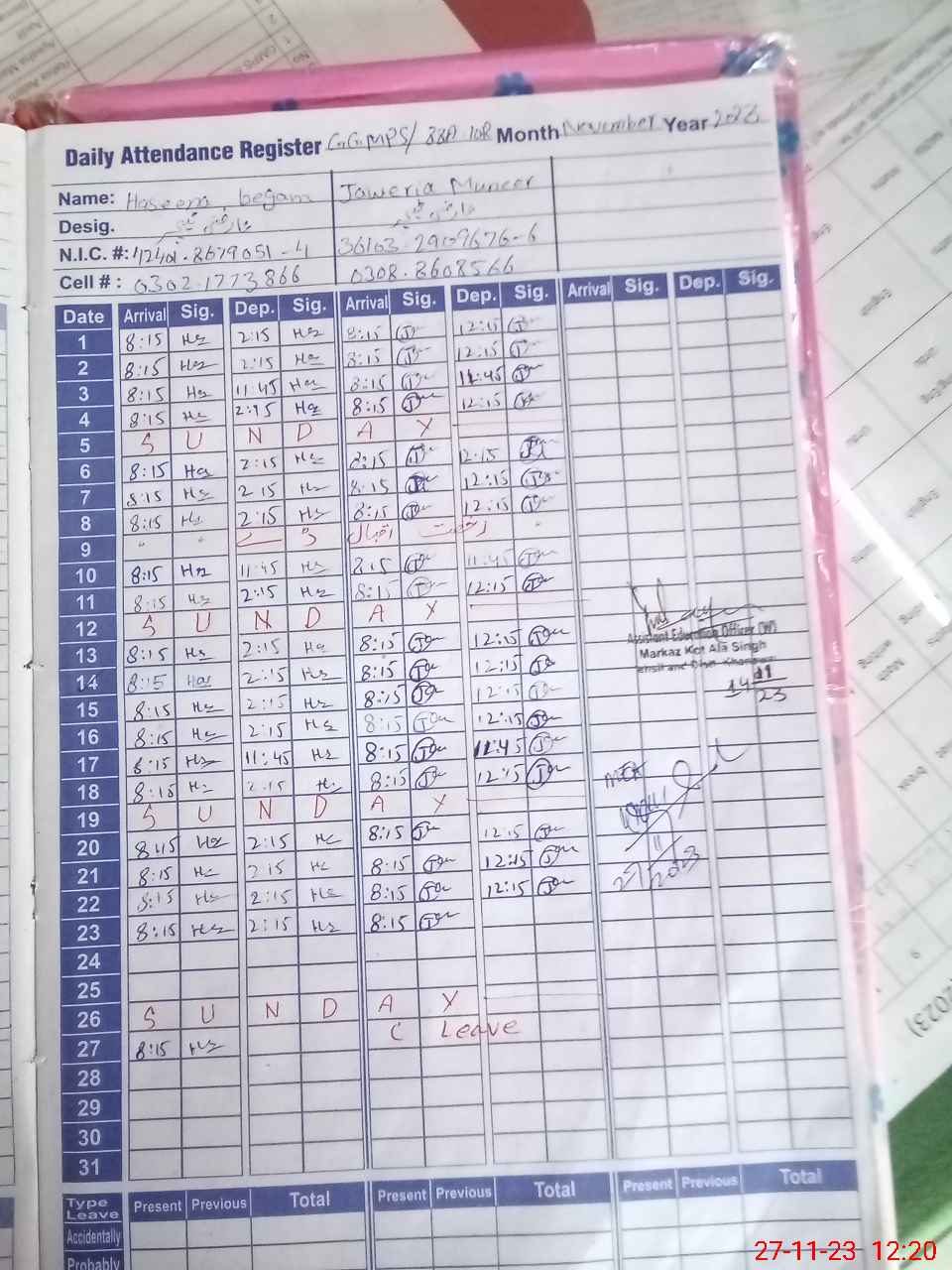 | CNIC | Full Name | Designation | R/C | Absence During Last Calender Month |