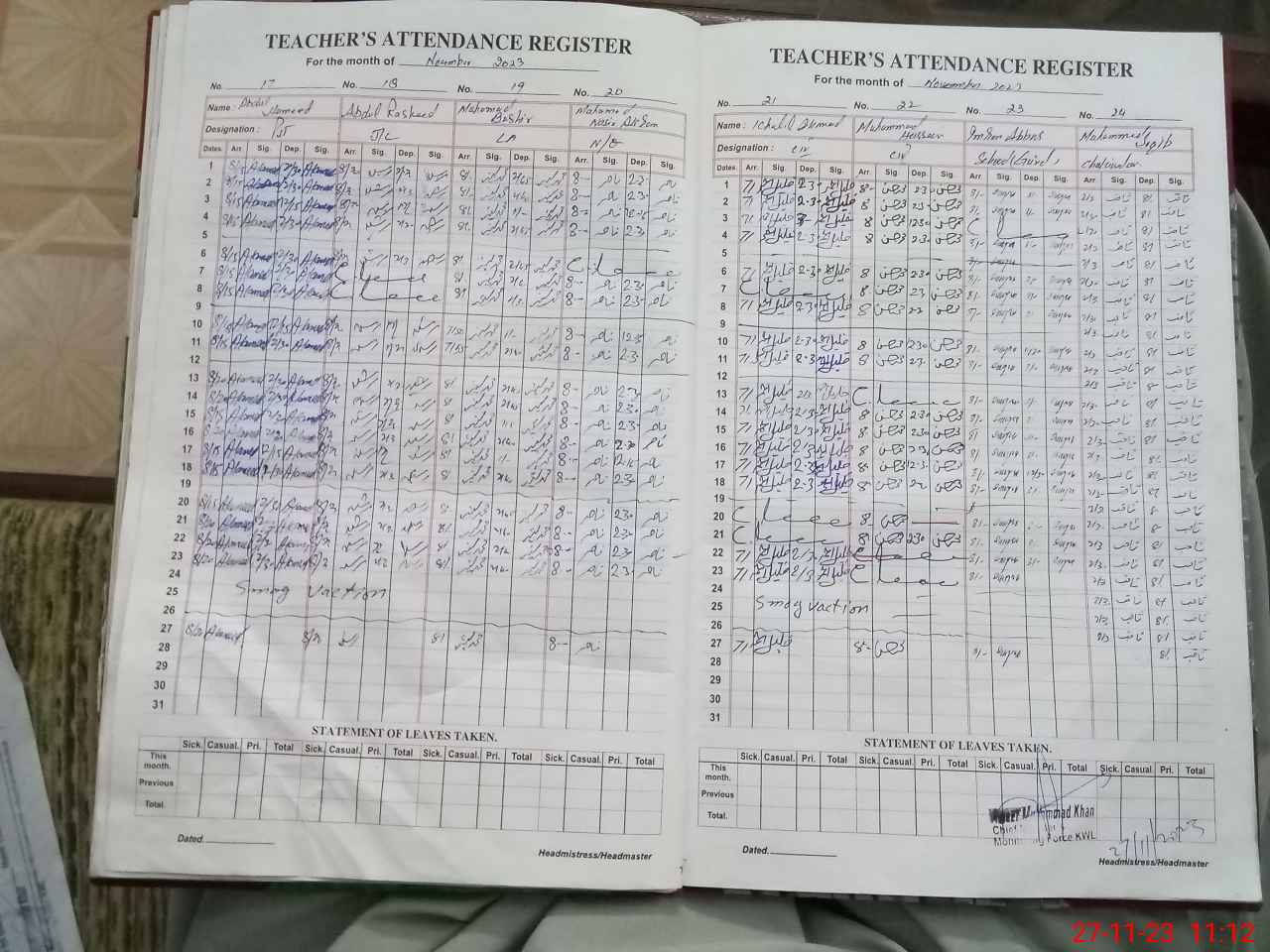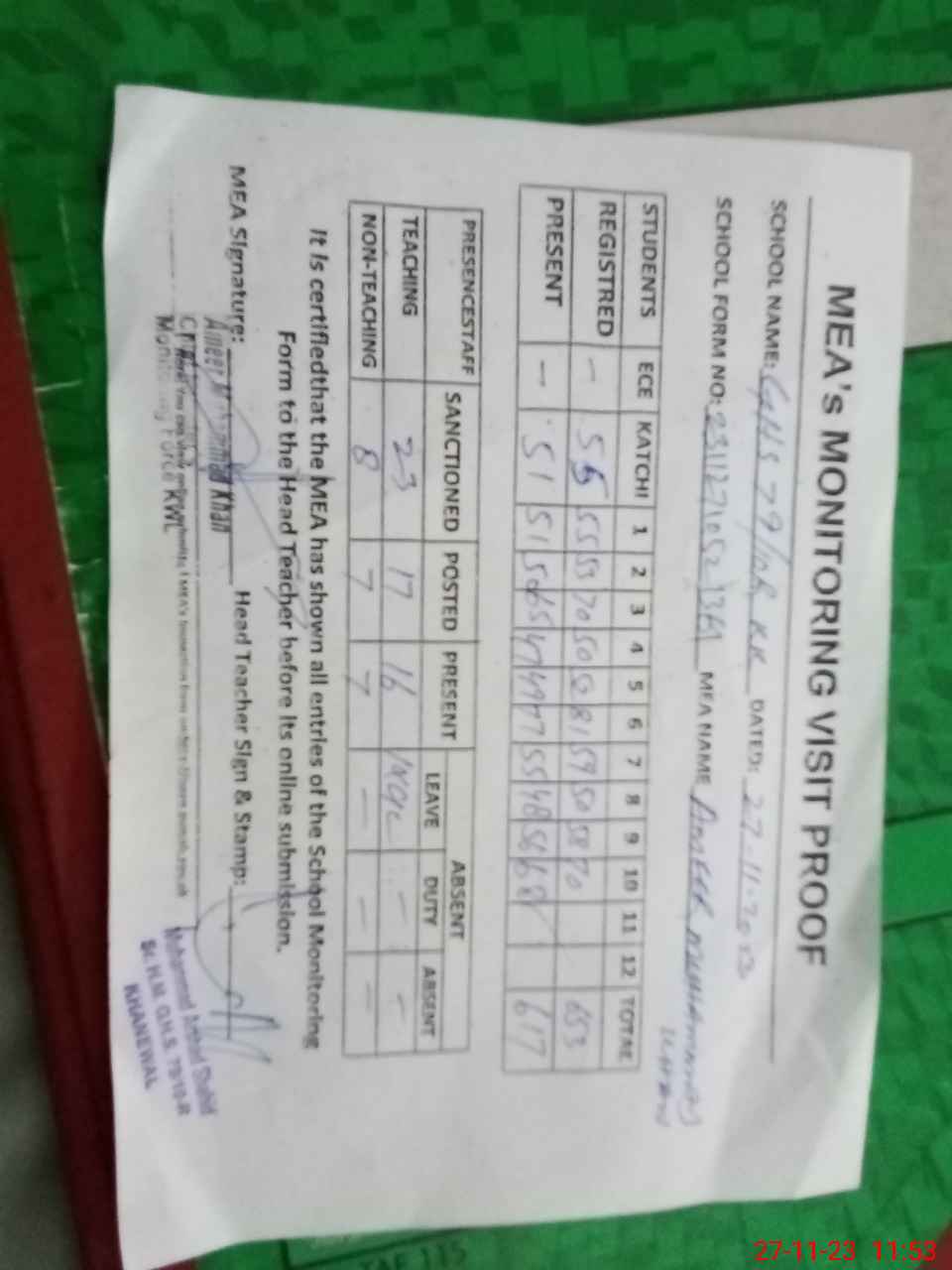 | Attendance Register | Head Teacher | MEA with School | Visit Proof |