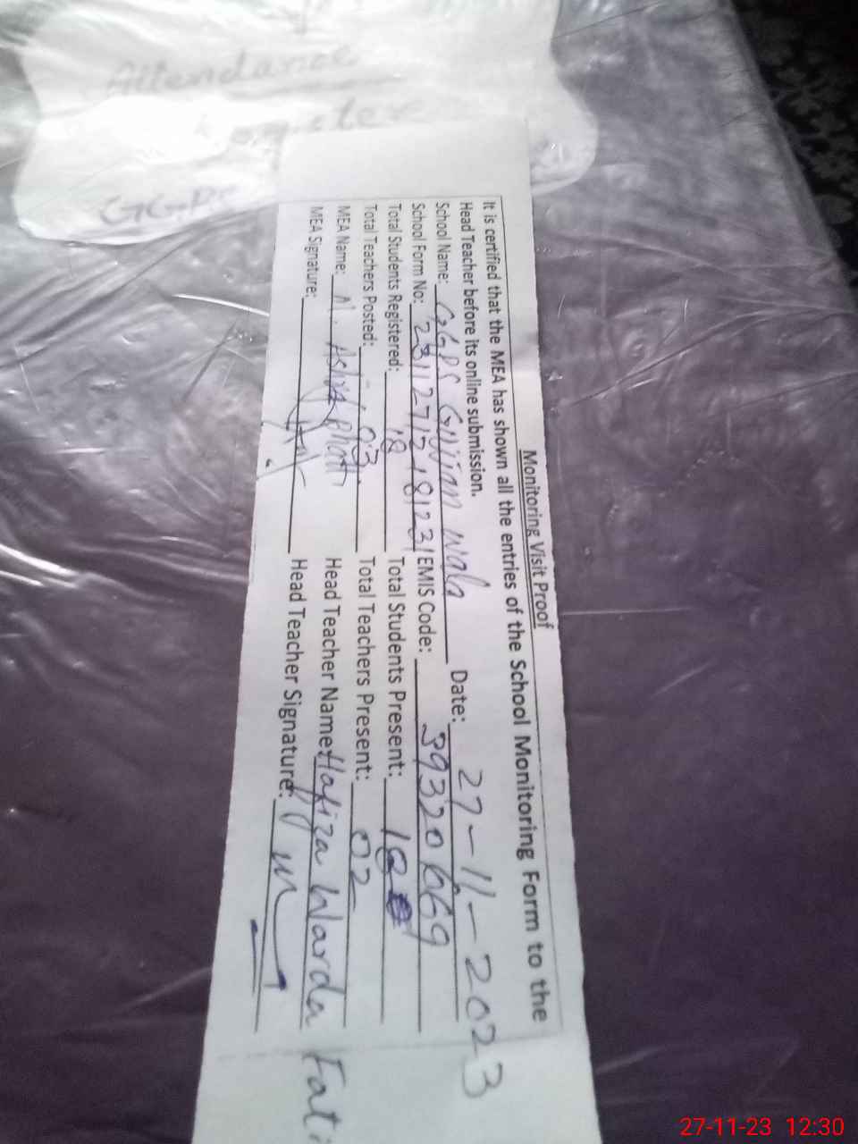 | Attendance Register | Head Teacher | MEA with School | Visit Proof |