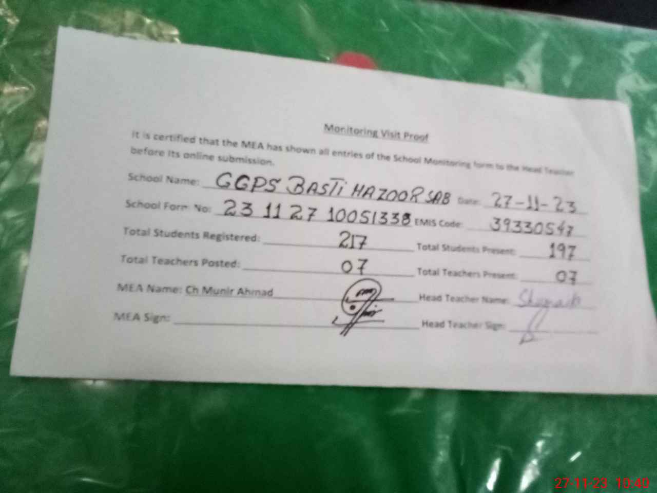 | Attendance Register | Head Teacher | MEA with School | Visit Proof |