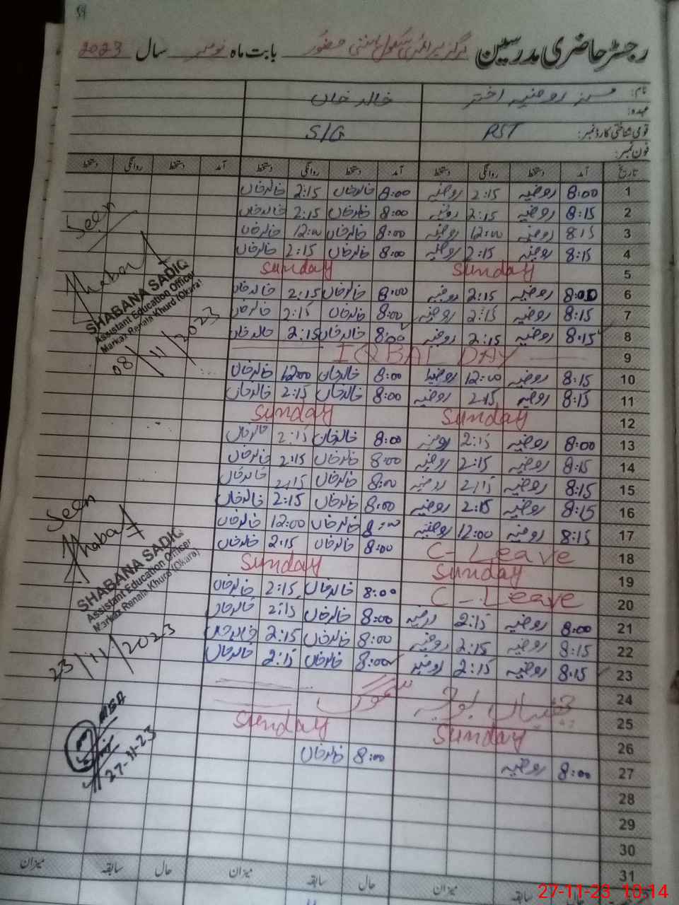 | CNIC | Full Name | Designation | R/C | Absence During Last Calender Month |