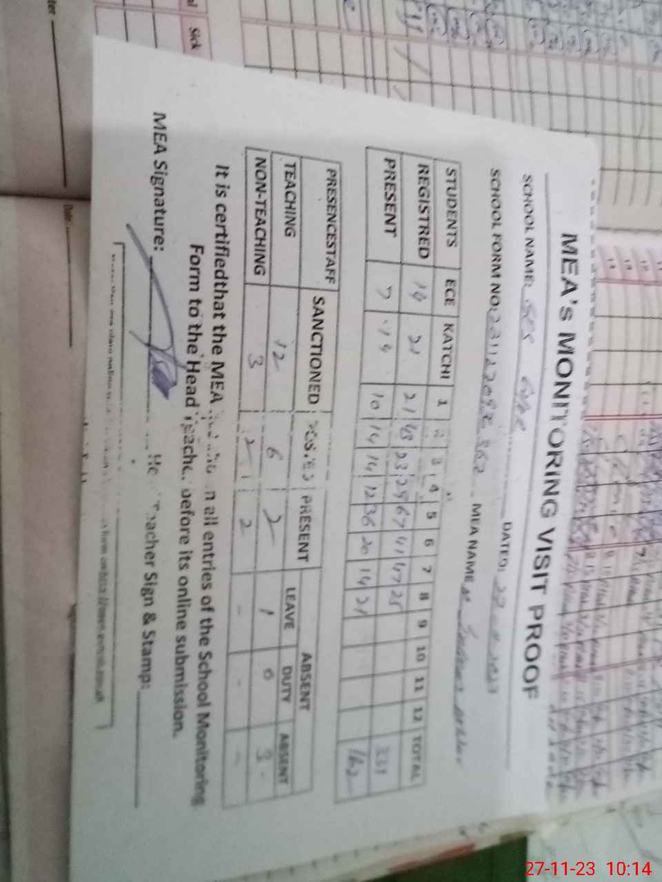 | Attendance Register | Head Teacher | MEA with School | Visit Proof |
