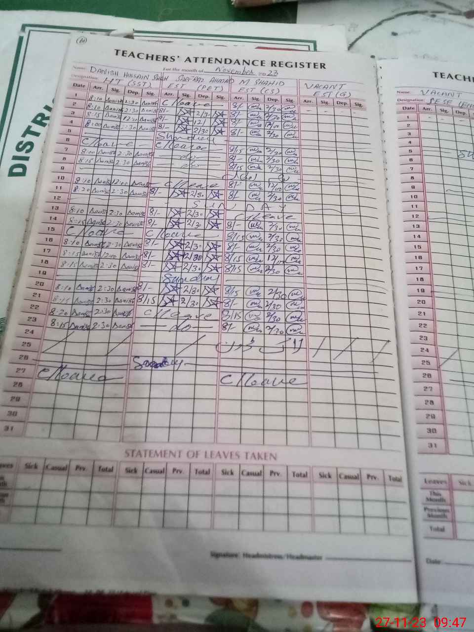 | Remarks (Use Separate Page if Required): Head teacher Danish Hussain shah And M shahid casual leave applied but not recommended or rejected status not showing on sis as per statement of head teacher A teacher sarfaraz found absent | |||||