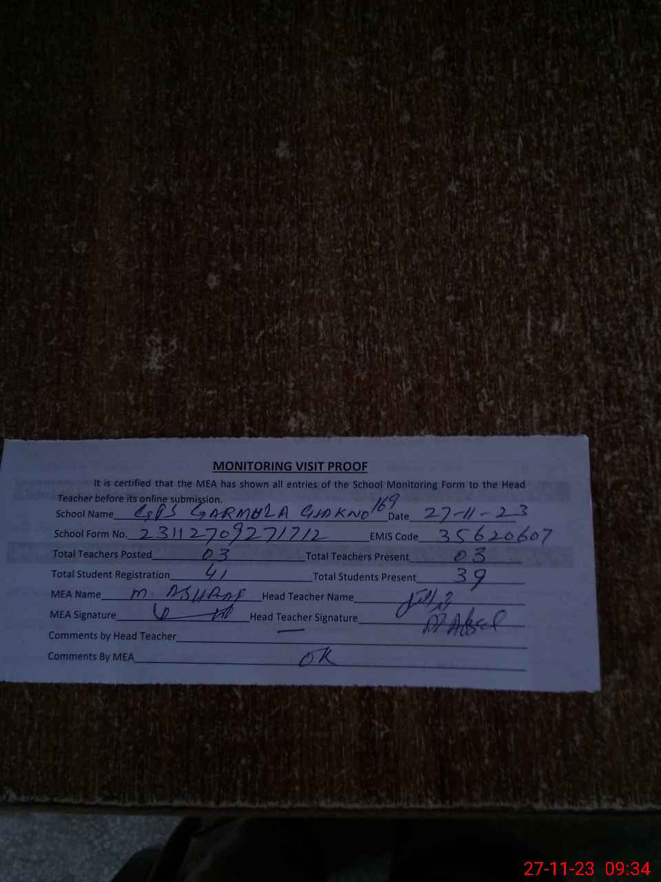 | Attendance Register | Head Teacher | MEA with School | Visit Proof |