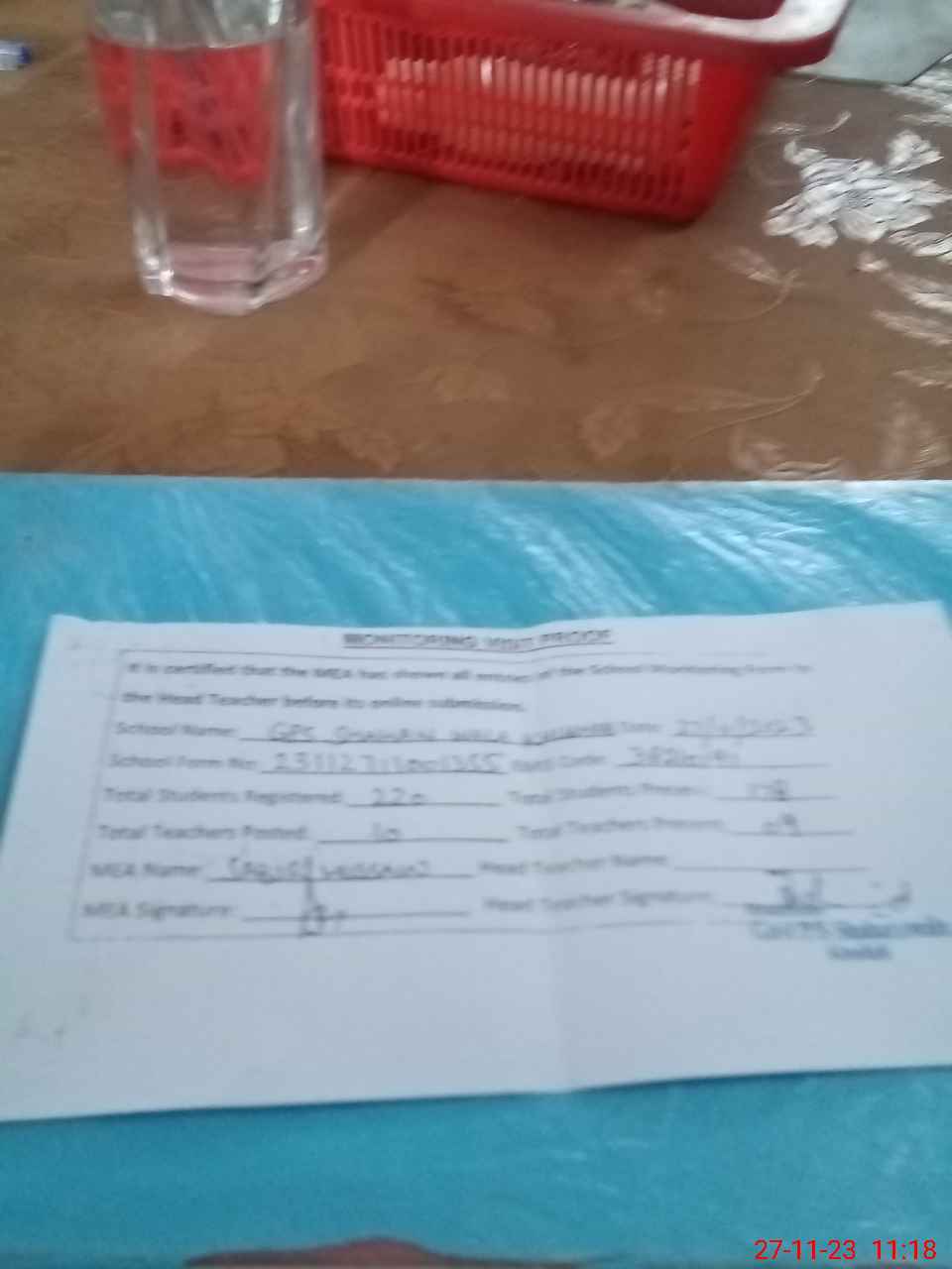 | Monitoring Date: 27-11-2023 | Start Time: 27-11-2023 10:42 AM | End Time: 27-11-2023 11:19 AM | Name of MEA: SA**** HU**** | |