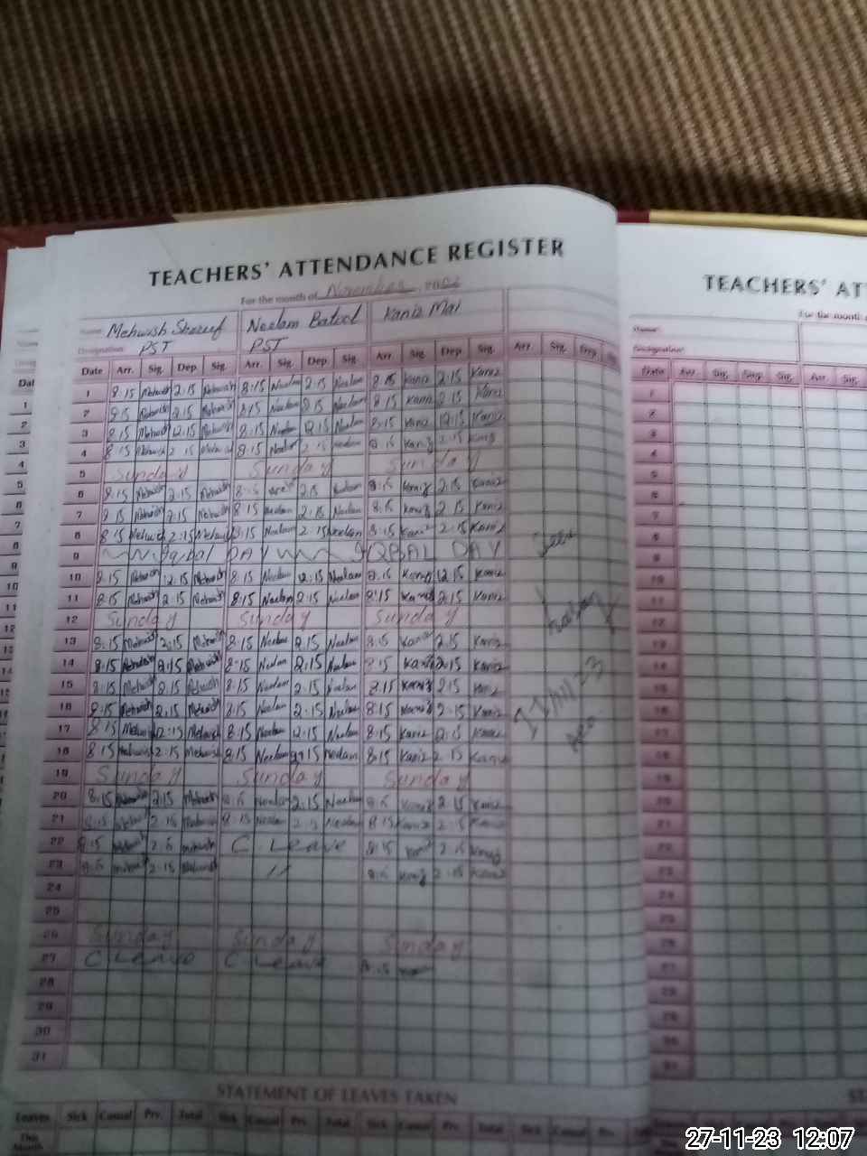 | CNIC | Full Name | Designation | R/C | Absence During Last Calender Month |