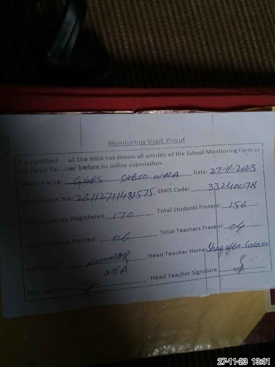 | Attendance Register | Head Teacher | MEA with School | Visit Proof |
