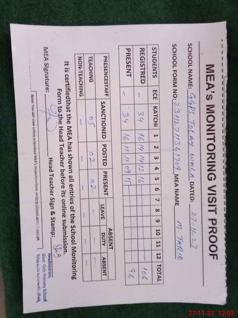 | EMIS Code: 36410341 | Name of School: GGPS TOLAY WALA, P/O KOHI WALA, KABIRWALA | |||