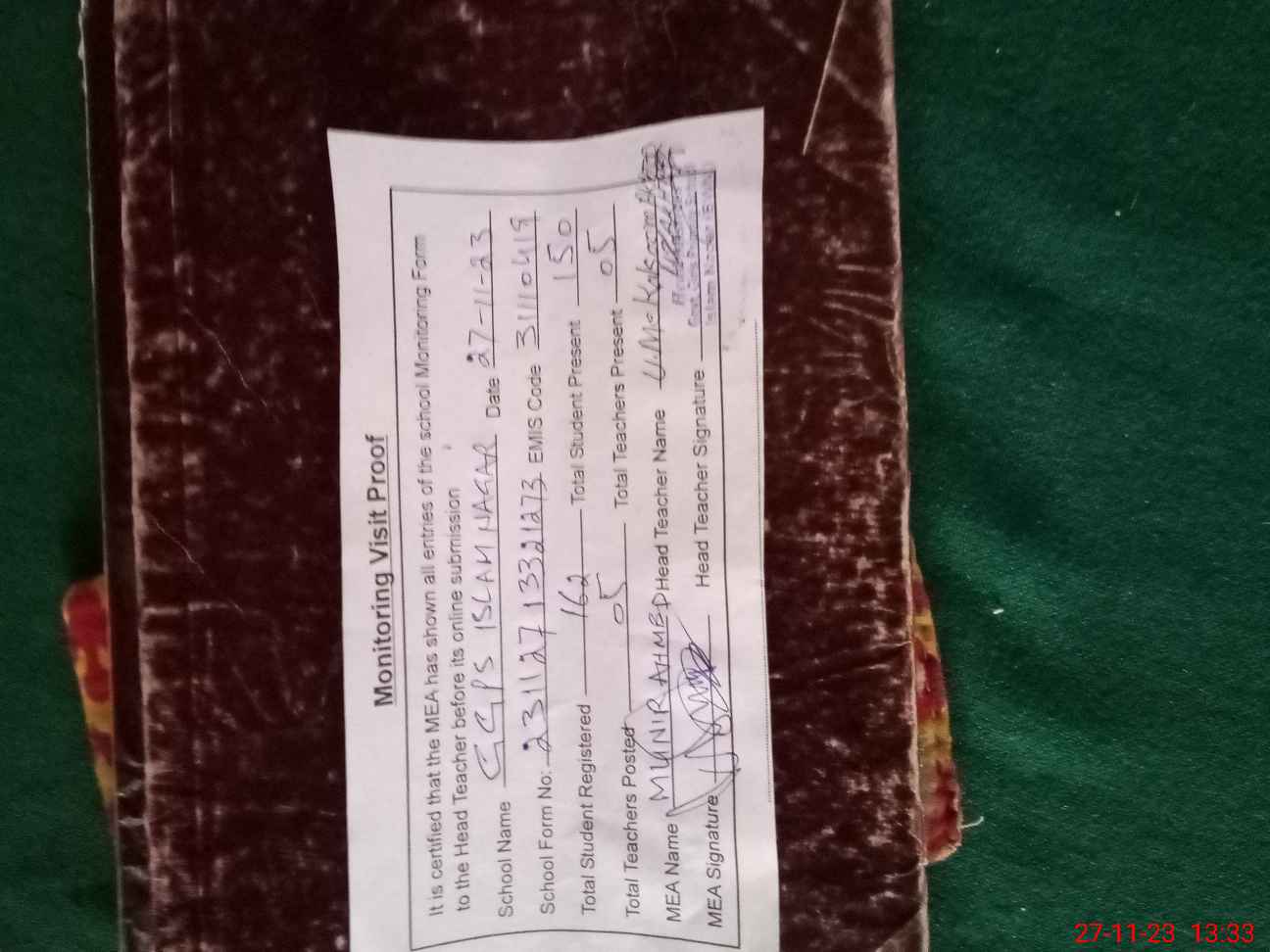 | Attendance Register | Head Teacher | MEA with School | Visit Proof |