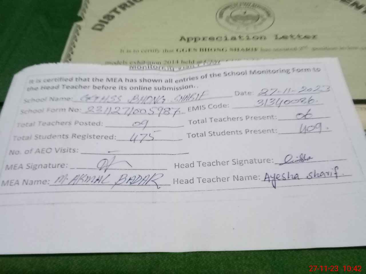 | EMIS Code: 31340086 | Name of School: GGHSS BHONG SHARIF | |||
