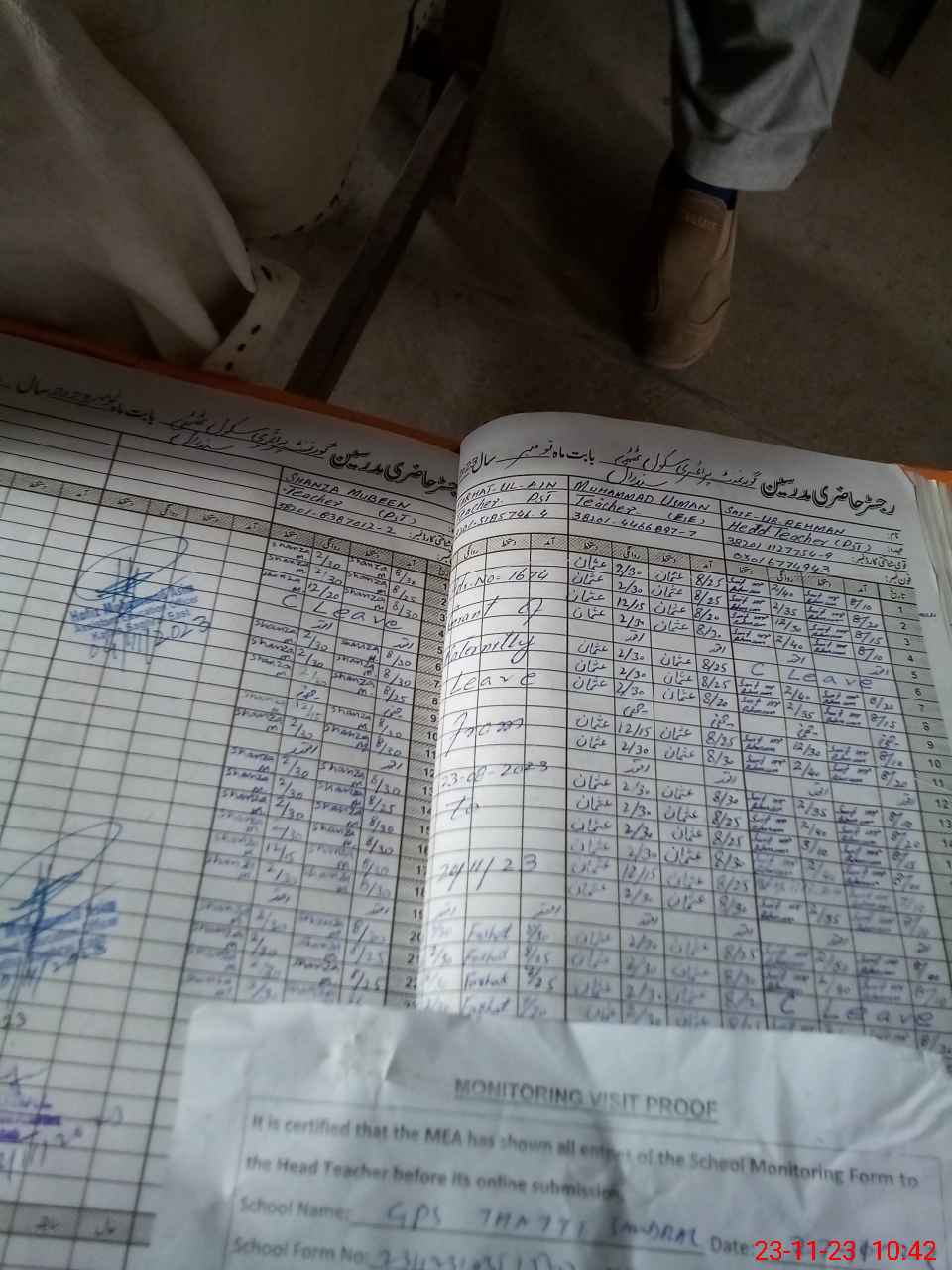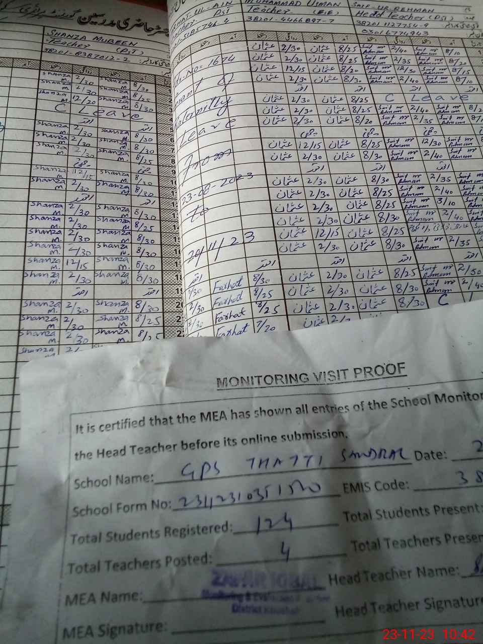 | Attendance Register | Head Teacher | MEA with School | Visit Proof |