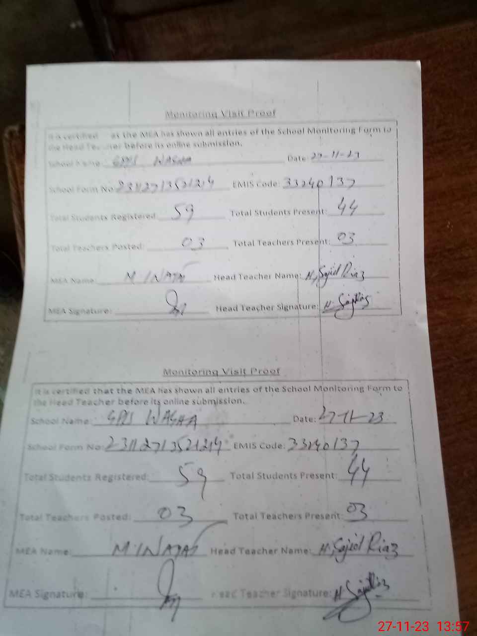 | Attendance Register | Head Teacher | MEA with School | Visit Proof |
