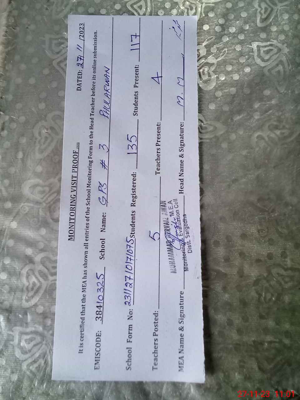 | EMIS Code: 38410325 | Name of School: GPS NO. 3 PHULARWAN | |||
