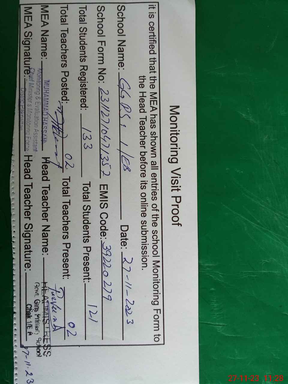 | Attendance Register | Head Teacher | MEA with School | Visit Proof |